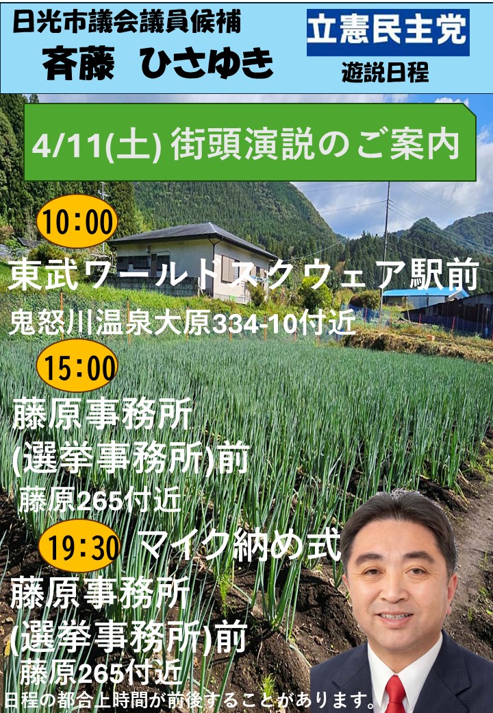 / 最終更新日 : kenren 4月11日(土)日光市議会議員候補・斎藤ひさゆき 選挙戦最終日遊説日程 日光市議会議員選挙(4月5日告示・12日投開票 定数22) 立憲民主党公認・斎藤ひさゆき 遊説日程 4月11日(土)≪選挙戦最終日≫ 街頭演説等のご案内 10:00 <街頭演説>東武ワールドスクエア駅 前 15:00 <街頭演説>斎藤ひさゆき選挙事務所 前 19:30 <マイク納め式>斎藤ひさゆき選挙事務所