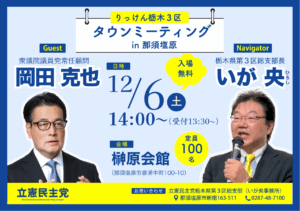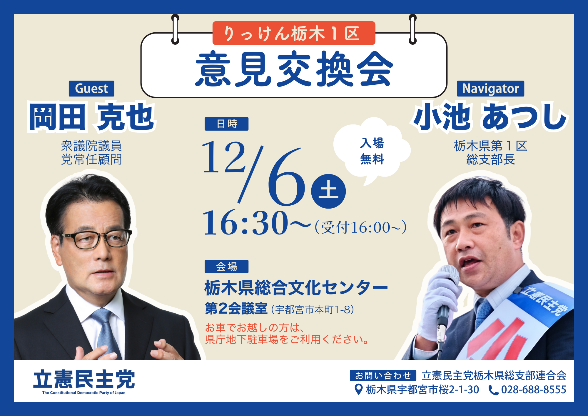 / 最終更新日 : kenren 【開催告知】2025年12月6日(土) りっけん栃木1区意見交換会 りっけん栃木1区意見交換会 日時:2025年12月6日(土)16時30分から 場所:栃木県総合文化センター・第2会議室(宇都宮市本町1-8) 当日は岡田克也元幹事長との意見交換や、小池あつし1区総支部長の政治活動報告、さらには所属議員の議会活動報告を予定しています。 入場無料、どなたでもご参加できます。 ※駐車場は県庁駐車場を利用できます。(2時間まで無料、チケットを受付けにお持ちください)