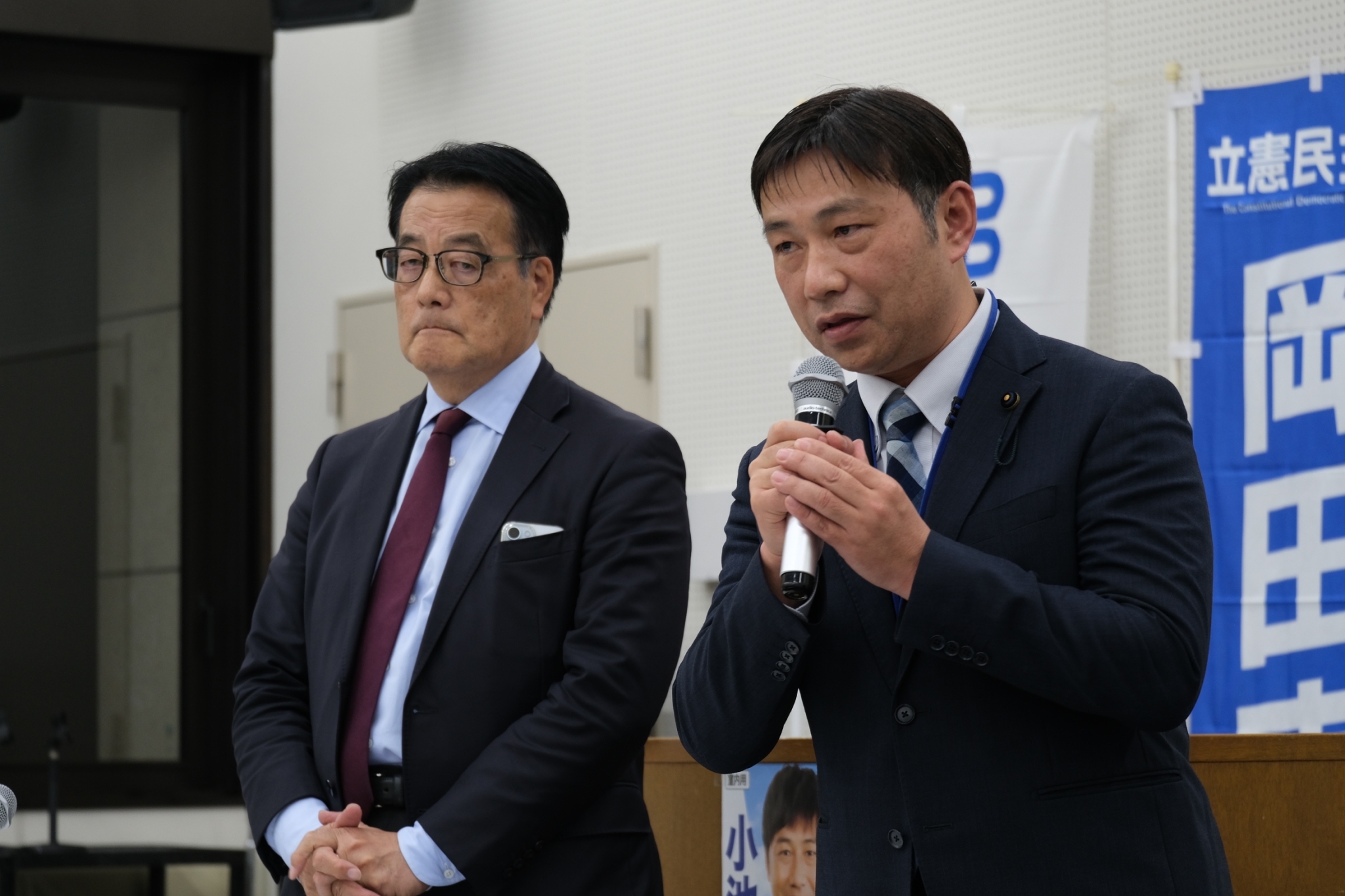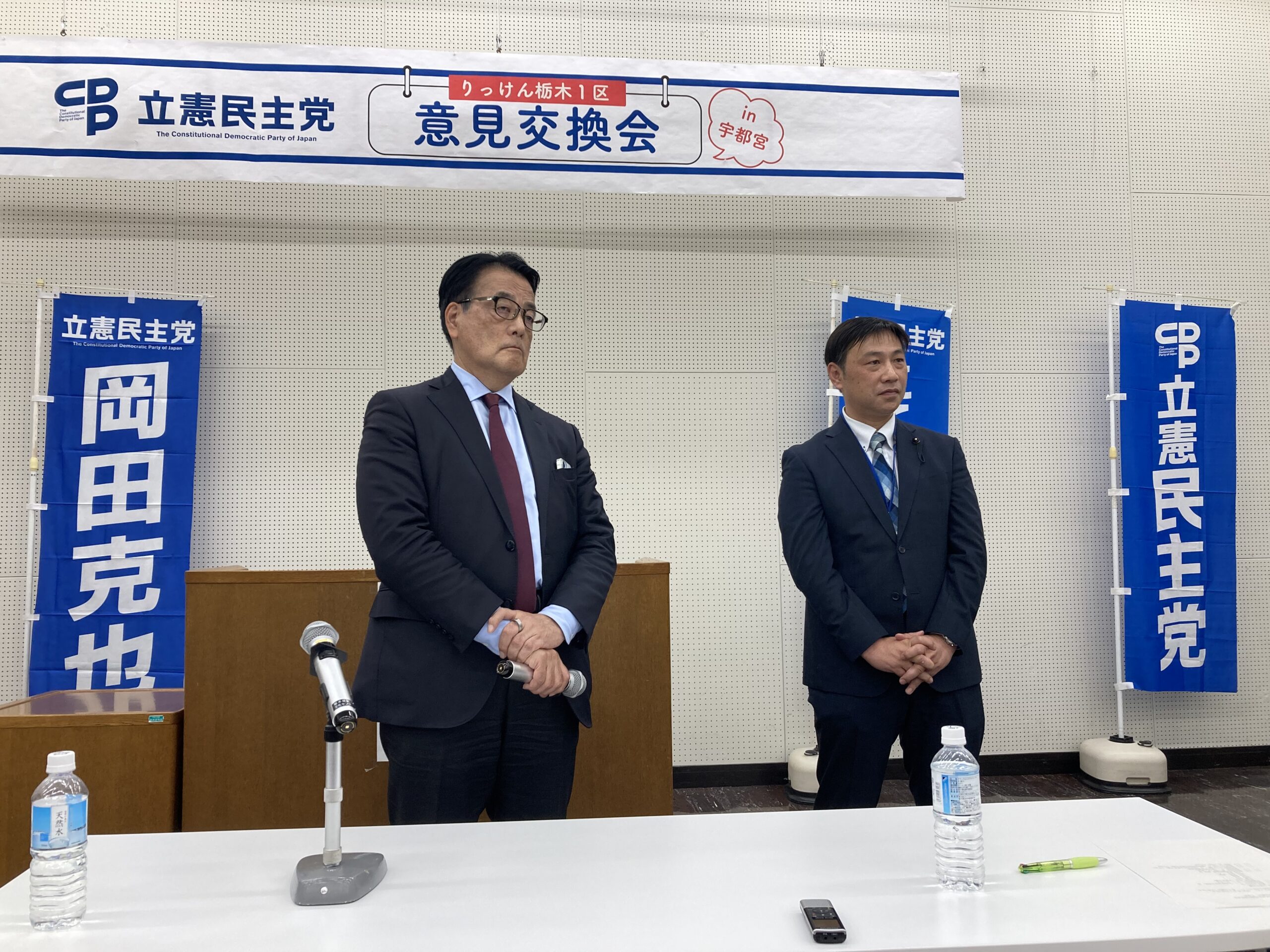 次期衆院選の公認内定者である小池あつし総支部長(県議)と、立憲民主党元幹事長の岡田克也衆院議員が登壇し、集まった支持者らと熱心な対話を繰り広げた。会場には1区総支部所属議員や連合栃木の役員らも駆けつけ、次期決戦に向けた結束を確認した。